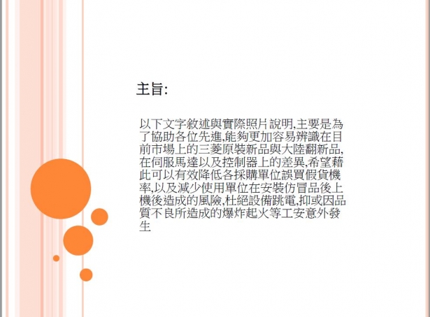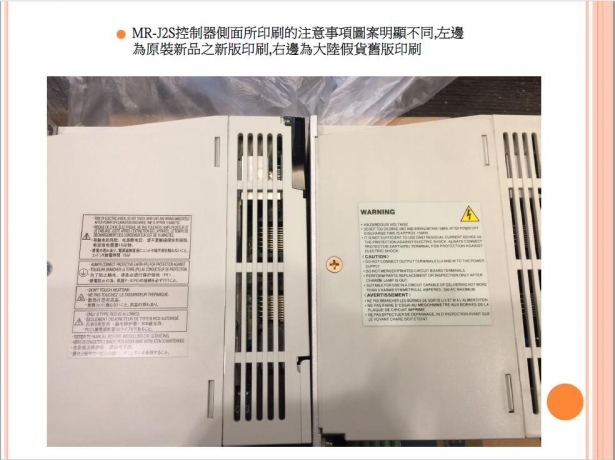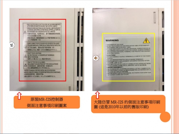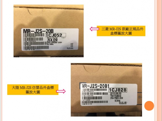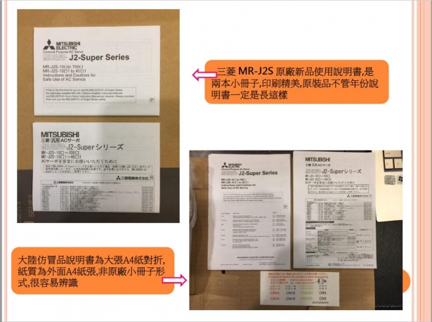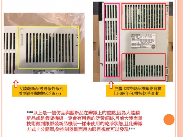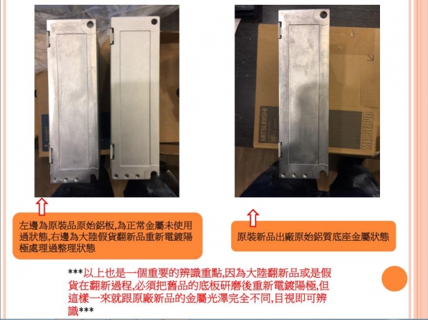 近來收到許多大廠客戶反映陸續購買到來路不明的三菱山寨版伺服馬達與驅動器,且造成上機問題重重與使用上的疑慮,所幸目前已多數送交三菱原廠檢驗,在此敝司敬告這樣的同業與諸多客戶先進,購買與販售來路不明的山寨品,仿冒品,輕則面臨客戶提告,原廠求償責任,重則公司身敗名裂(銷售方),而使用仿冒品與山寨品上機,則面臨到設備毀損,保固取消等重大損失,敝司已經掌握數家打著原廠新品名號,卻私下銷售仿冒品與山寨品的同業,為了維護台灣業界的良好風氣,避免劣幣驅逐良幣的情況一再發生,敝司將於掌握確切檢測結果後,擇日公佈相關不良廠商於敝司通路,以正視聽!!!